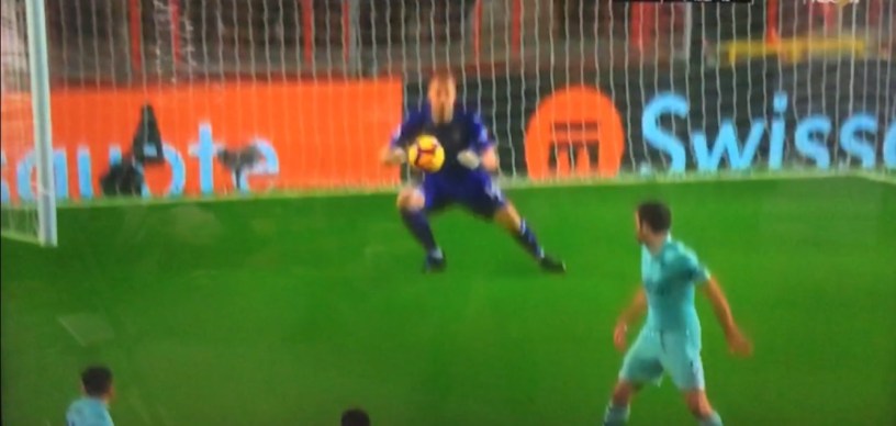 In a recent game between Arsenal and Manchester Utd, the Arsenal keeper Leno was called upon to make a snap save from a shot from just outside the penalty area.