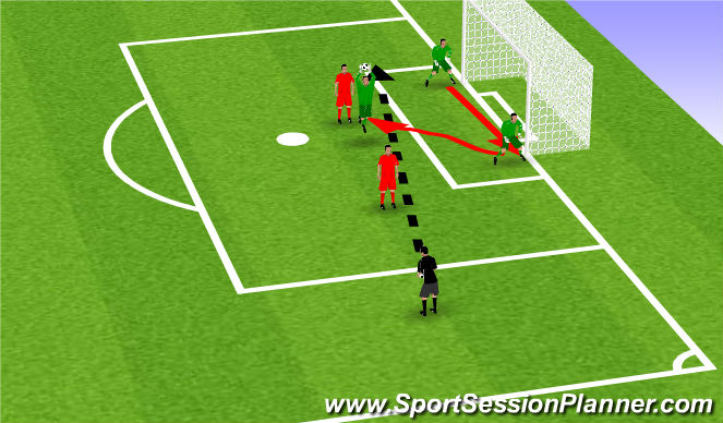 Vary the “crosses” – some long and high, past the second far “obstruction”, some short and in front of the near “obstruction”. Occasionally throw the ball into the goal, catching out a clever keeper who’s already on their way between the obstructions.