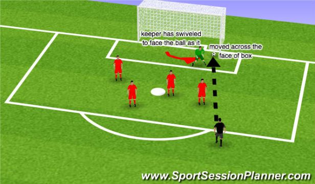 Look for the keeper to adjust their feet and “set” position as the ball moves across the face of the box. If their positioning and angle was right as the attackers starts their move, it’s unlikely to still be right as they end up on the other end of the box. The keeper should be adjusting. If they aren’t, then encourage them to move their feet as their eyes give them more info.