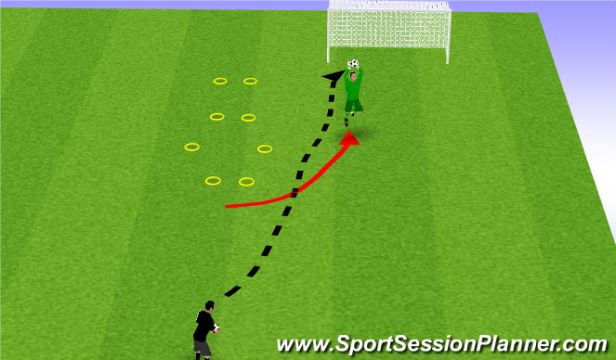 Vary the “crosses” – some long and high, past the second far “obstruction”, some short and in front of the near “obstruction”. Occasionally throw the ball into the goal, catching out a clever keeper who’s already on their way between the obstructions.