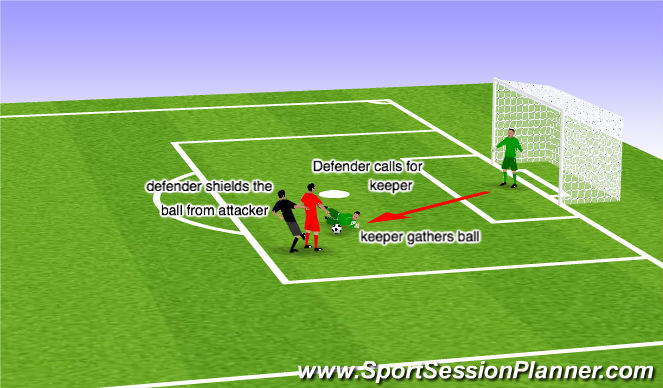 This drill simulates a typical situation in a game, and helps build cohesion between defender and keeper. The keeper learns to be vocal, and to judge the danger from coming for a ball which is shielded by the defender.