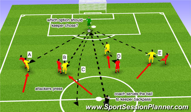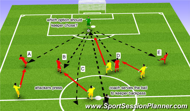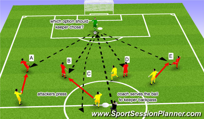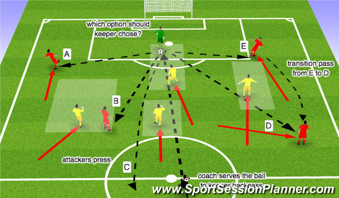 In this example the striker marking D decides to press the goalkeeper, while the other opponents press towards A, B and E.