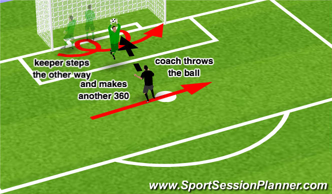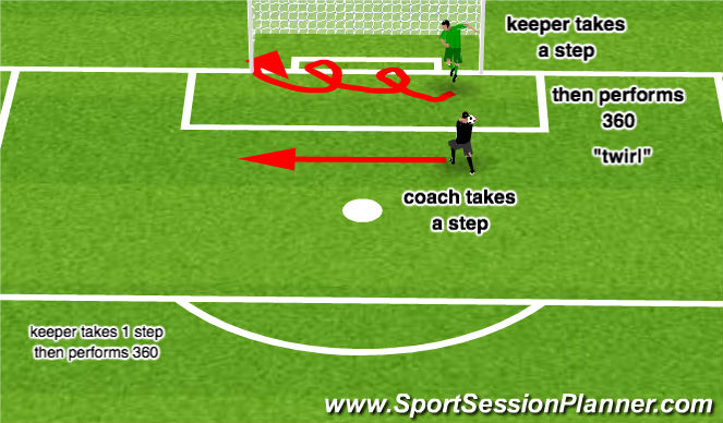 There is a keeper on the line near one post, and another keeper, or the coach, acting as a server, standing opposite them. The keeper takes one step then immediately performs a 360 degree twirl, before facing the server who has also taken a couple of steps to remain in front of the keeper.