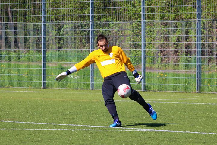 The keeper sprints towards the goal line, then pauses, stopping for a second, then throws of punts the ball into the net.