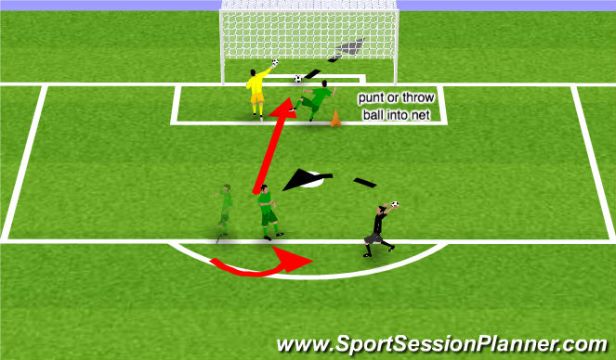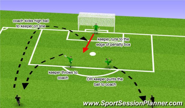 A variation has the coach shout “left” or “right” just as the keeper gets to the line, telling the keeper where to throw/punt the ball (left or right corner of net). If the coach doesn’t shout a direction the keeper throws/punts into the centre of the goal.