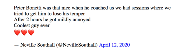 Of course, a career so successful – 495 appearances for Chelsea, only 39 outside the First Division (original EPL) and 7 caps for England, FA Cup, European Cup Winners Cup and League Cup winners medals) – naturally had highs and lows, and Peter was a credit to the goalkeeping profession, in remaining good spirited throughout. This tweet by “big Nev” Southall encapsulates that ideal.