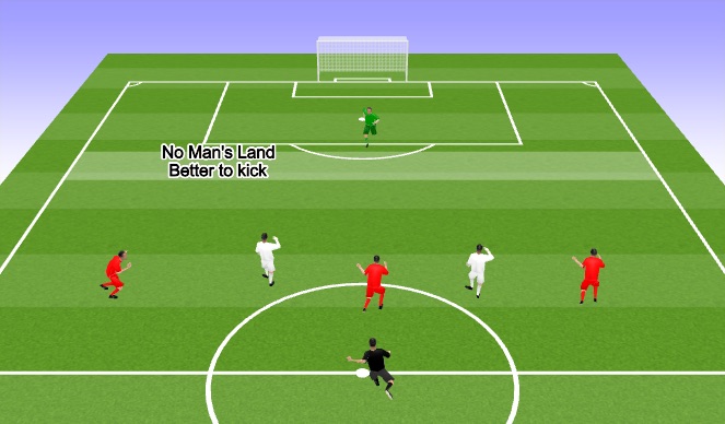 This awkward zone we calls “No Man’s land” is the area starting about two yards in front of the edge of the penalty box, and continuing towards the half way line some 5-6 yards. See this diagram below.